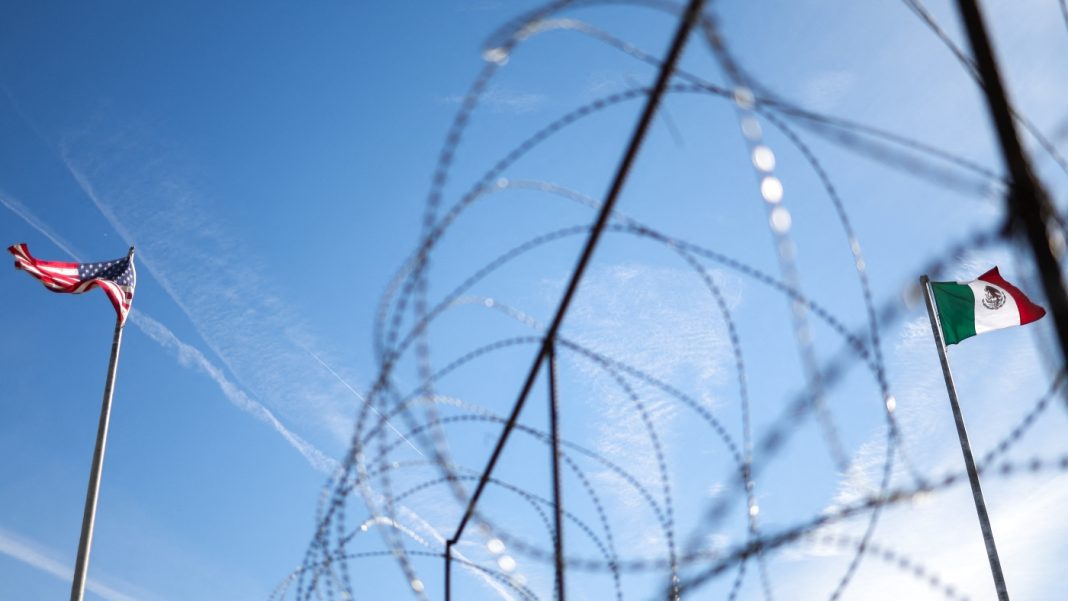 An American flag (L) and Mexican flag (R) fly along the US-Mexico border in El Paso, Texas in January 2025.