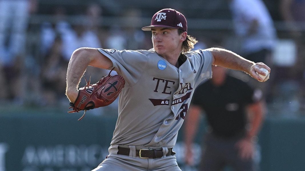 June 9, 2024, College Station, Texas: Texas A&M pitcher Shane Sdao (38) throws a pitch during the first inning against Oregon at Olsen Field, Blue Bell Park. (Maria Lysaker-USA Today Sports)