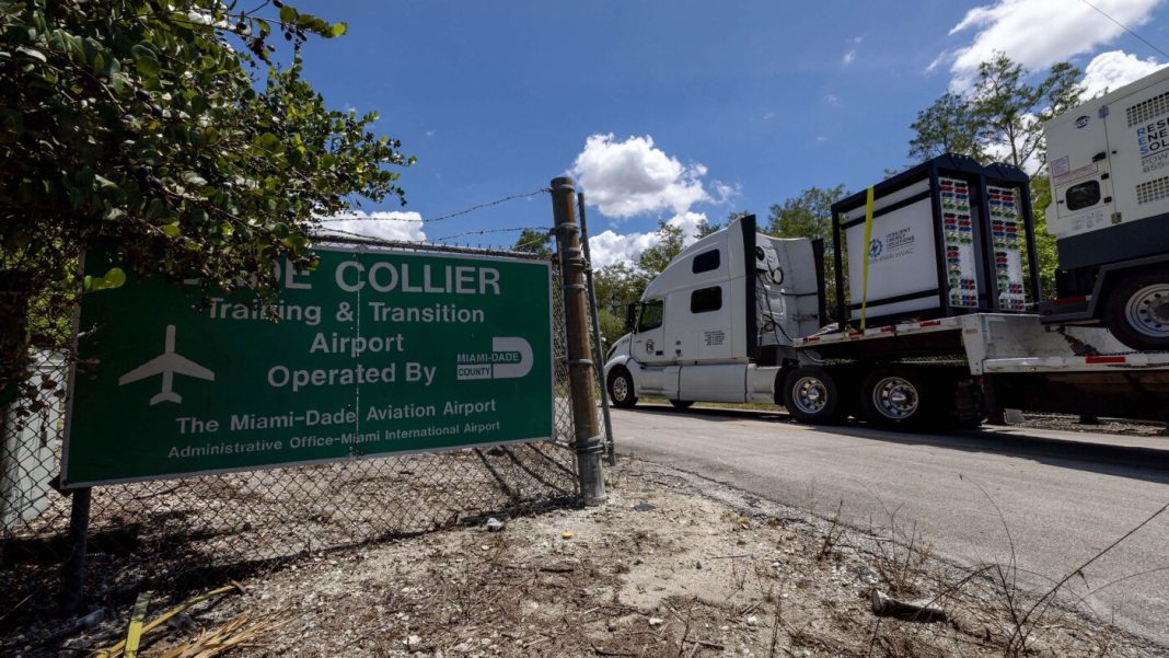 Heavy-duty generators are driven into Dade-Collier Training and Transition Airport last week. Trump is due to visit the site of Florida’s newest immigration detention center on Tuesday.
